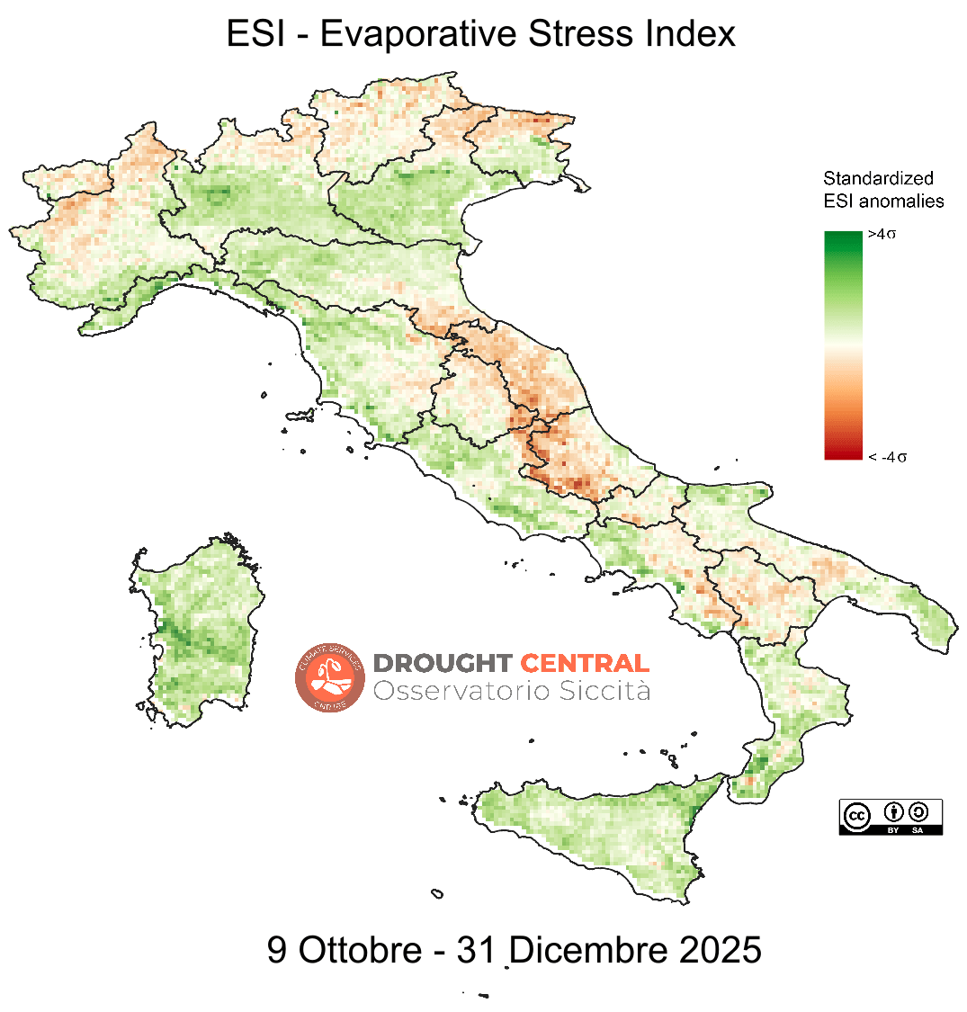 L’indice ESI (Evaporative Stress Index) quantifica anomalie temporali standardizzate del rapporto fra evapotraspirazione reale e potenziale e fornisce indicazioni “proxy” circa la rapida evoluzione dell’umidità superficiale del suolo e delle condizioni di stress delle colture.