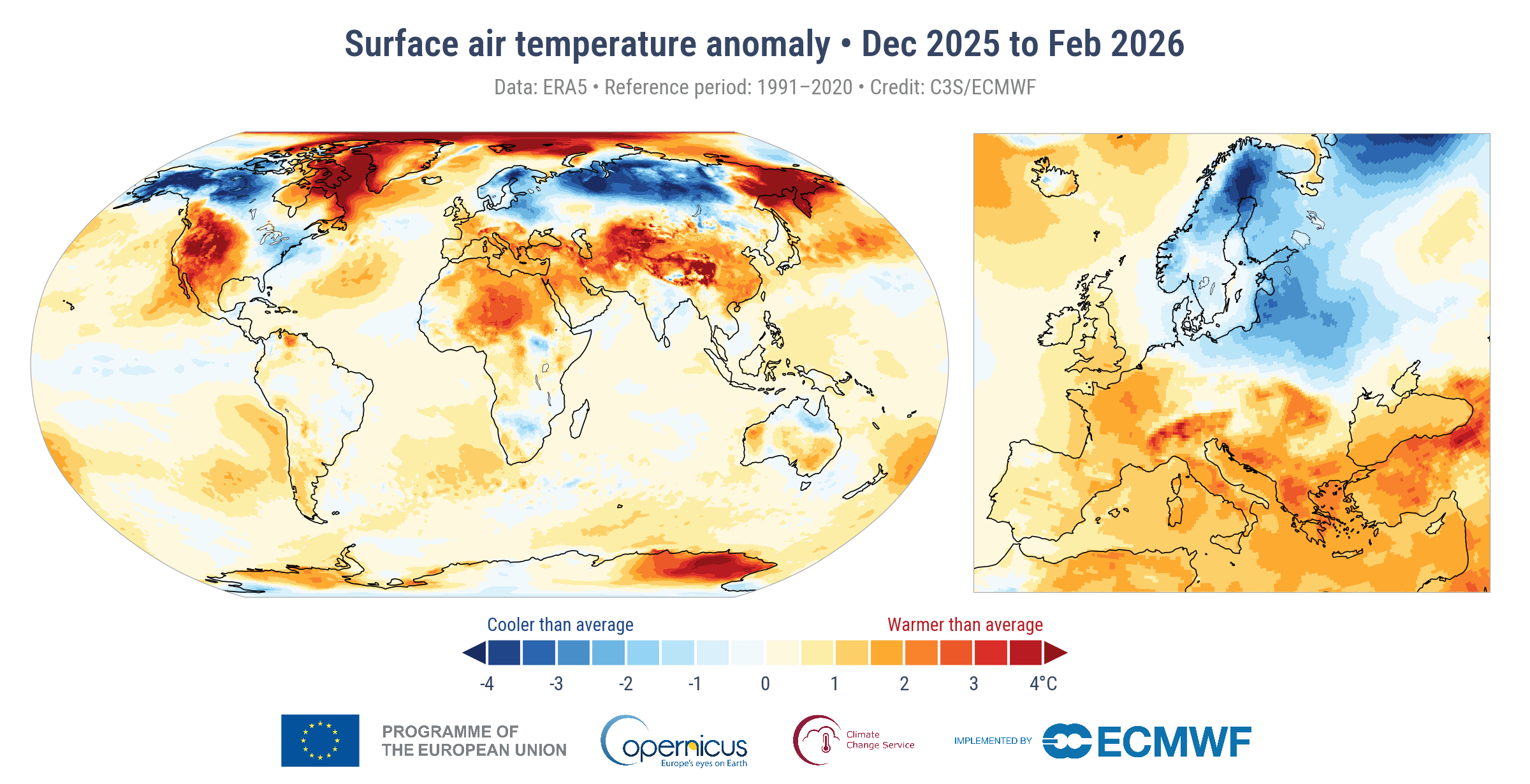 Secondo i dati Copernicus, a livello globale Febbraio è stato il quinto più caldo dal 1979 rispetto alla media del periodo di riferimento 1991-2020, così come la stagione invernale. In Europa, invece, le anomalie del mese sono state quasi in media (-0.1°C) a causa di una netta distinzione fra le anomalie positive che hanno interessato tutta l’area mediterranea e le zone occidentali e di sud-est, e le opposte anomalie negative sulla regione finnoscandinava, i Paesi del Baltico e la Russia nord-occidentale (vedi mappa). Anche le piogge hanno avuto una distribuzione opposta, con un mese più umido della norma sull’Europa occidentale e meridionale, e condizioni più secche sul resto del continente. Le precipitazioni hanno portato in alcuni casi anche ad eventi molto intensi ed alluvionali, in particolare sulla penisola iberica e Francia occidentale.