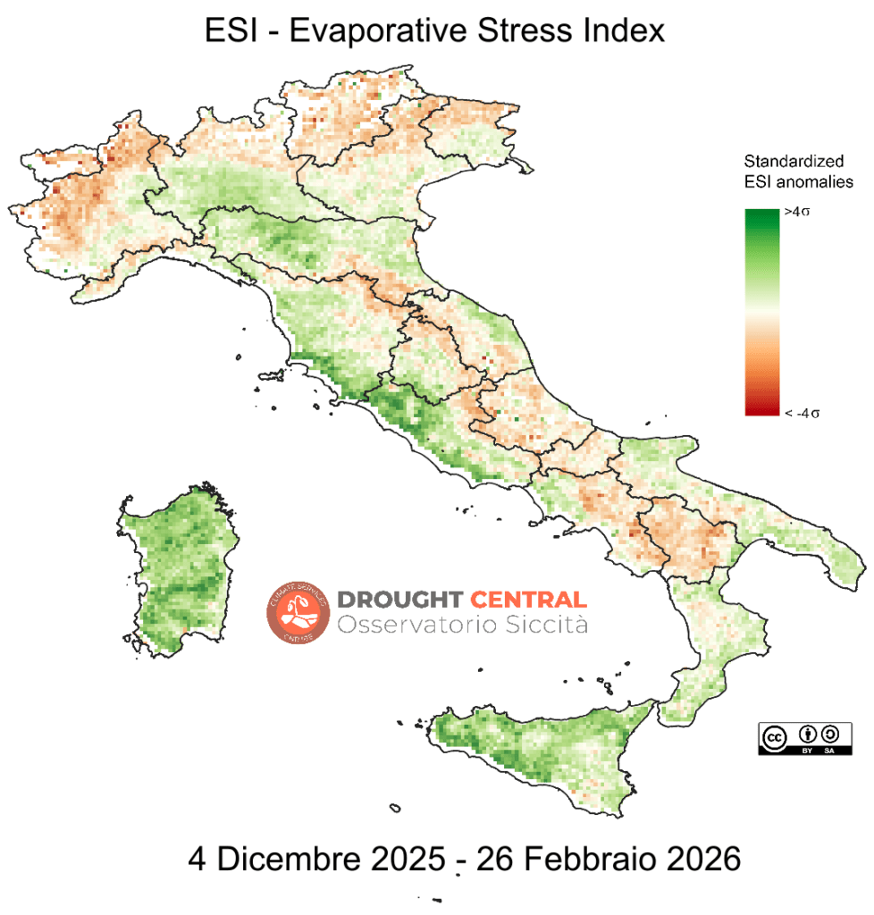 Le anomalie ESI di Febbraio e della stagione invernale mostrano una configurazione simile, con valori negativi concentrati sulle zone alpine e prealpine e Appennino. Anomalie positive più elevate sono visibili sulle coste toscane centro-meridionali, alto Lazio, Sardegna e Sicilia, in particolare in riferimento al trimestre Dicembre-Febbraio.