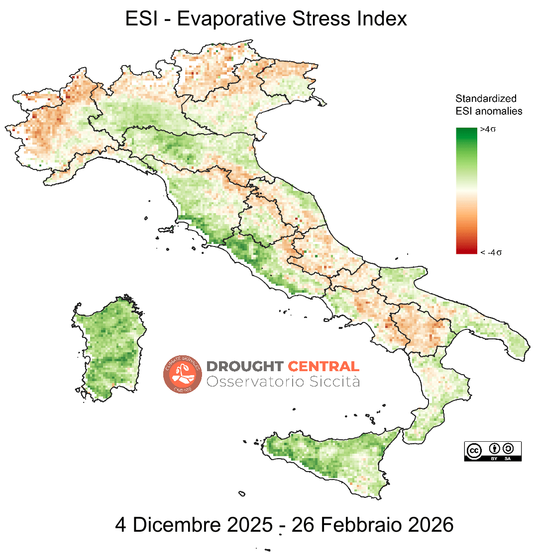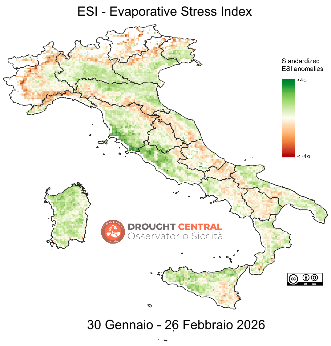 L’indice ESI (Evaporative Stress Index) quantifica anomalie temporali standardizzate del rapporto fra evapotraspirazione reale e potenziale e fornisce indicazioni “proxy” circa la rapida evoluzione dell’umidità superficiale del suolo e delle condizioni di stress delle colture.