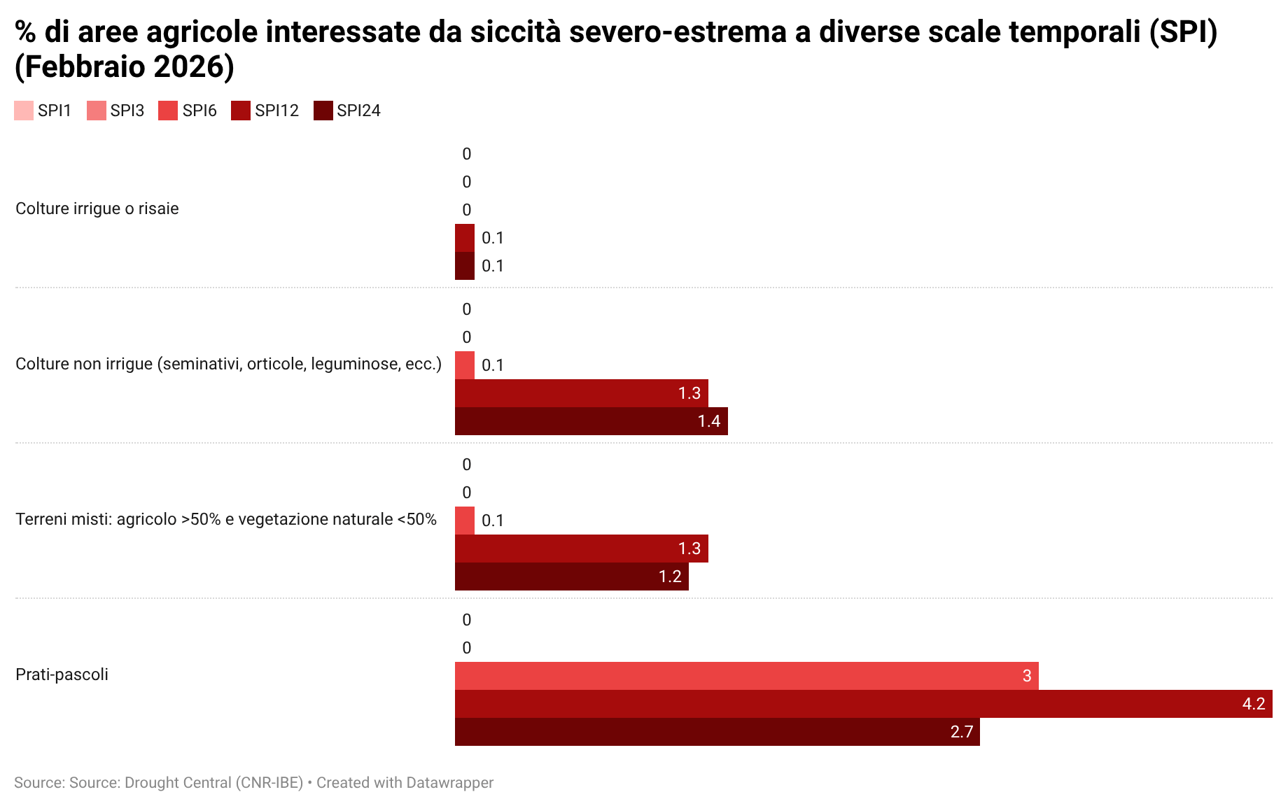 • Percentuale di aree agricole interessate da siccità severo-estrema: i prati-pascoli sono la tipologia colturale con le percentuali più alte, ma comunque contenute al di sotto del 5%.