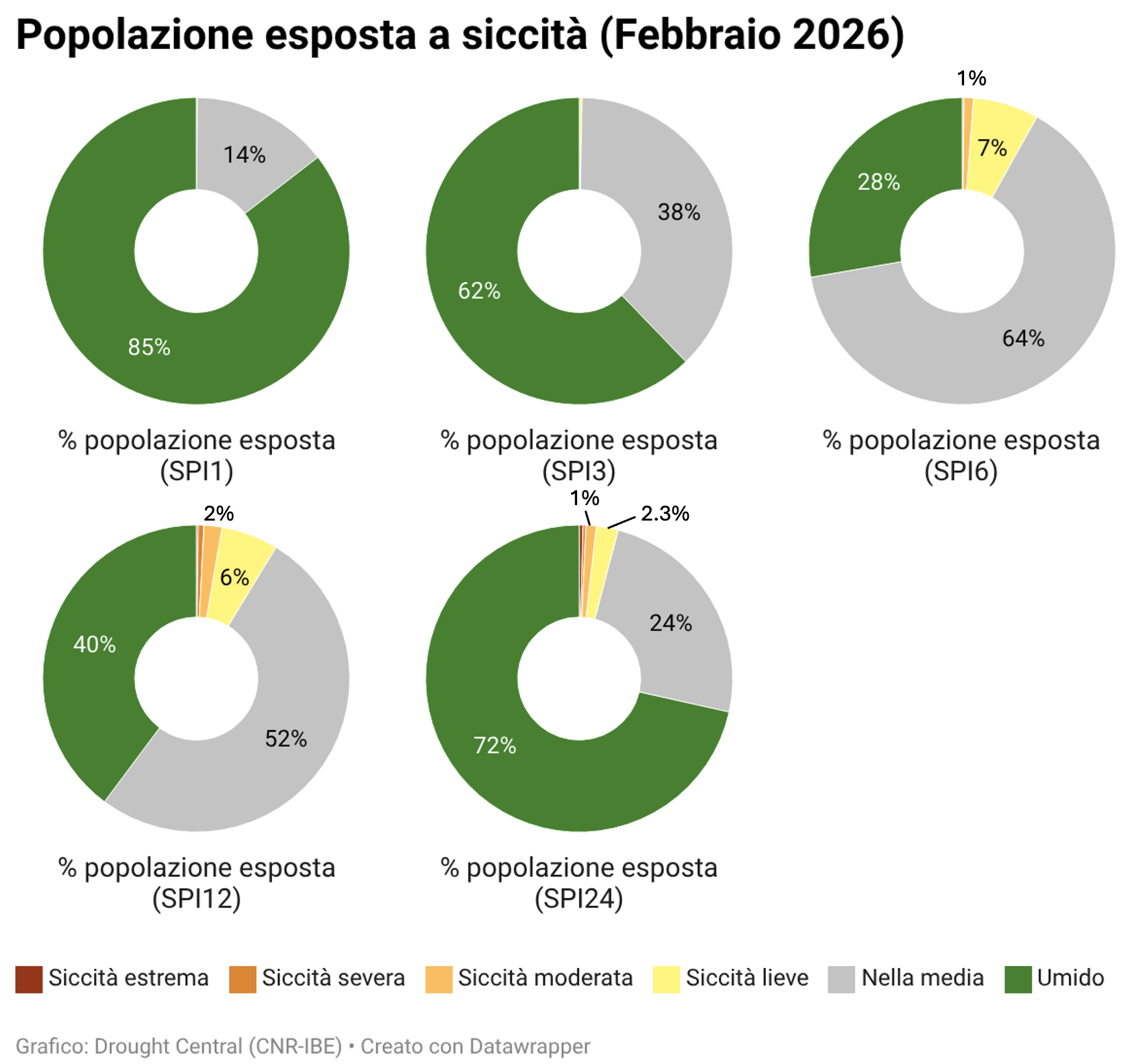 • Percentuale di popolazione esposta a siccità: nettamente ridotta la fetta di popolazione che si trova in condizioni secche e contenute per lo più fra intensità lieve e moderata.