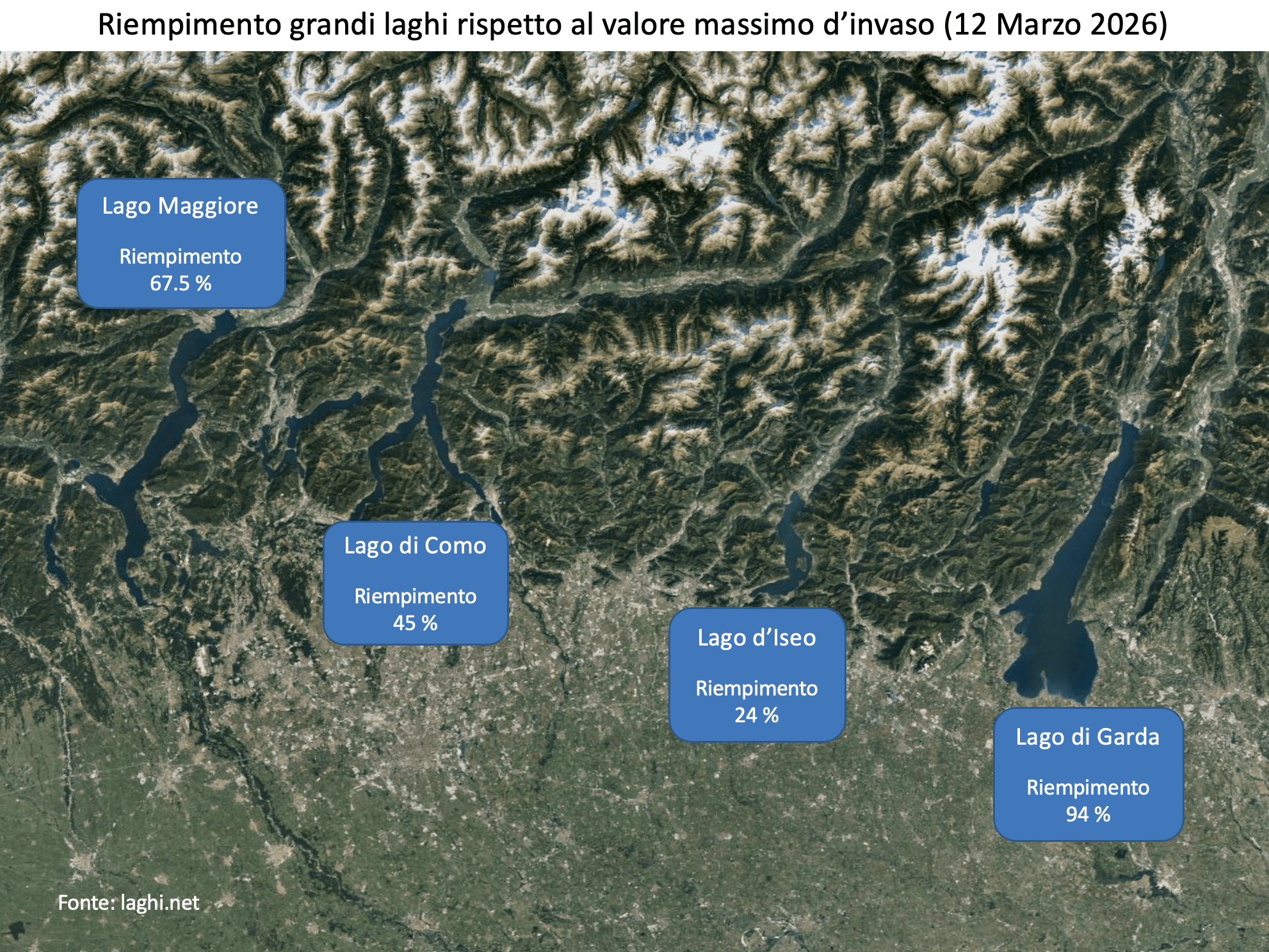 • Grandi laghi del nord Italia: Nella prima decade di Marzo i principali laghi presentano altezze idrometriche superiori alla media, eccetto l’Iseo che invece continua ad essere sotto i valoro normali.