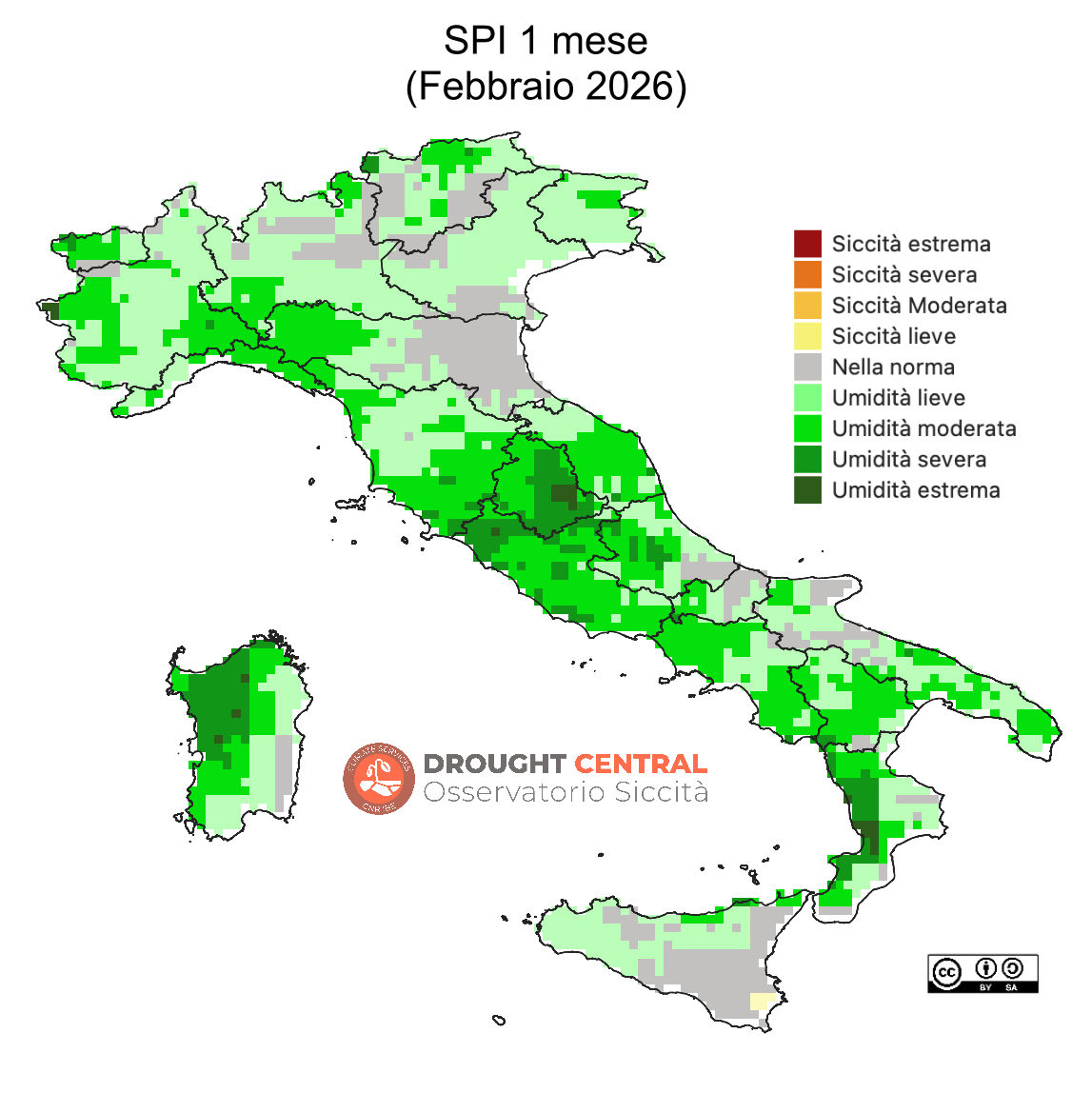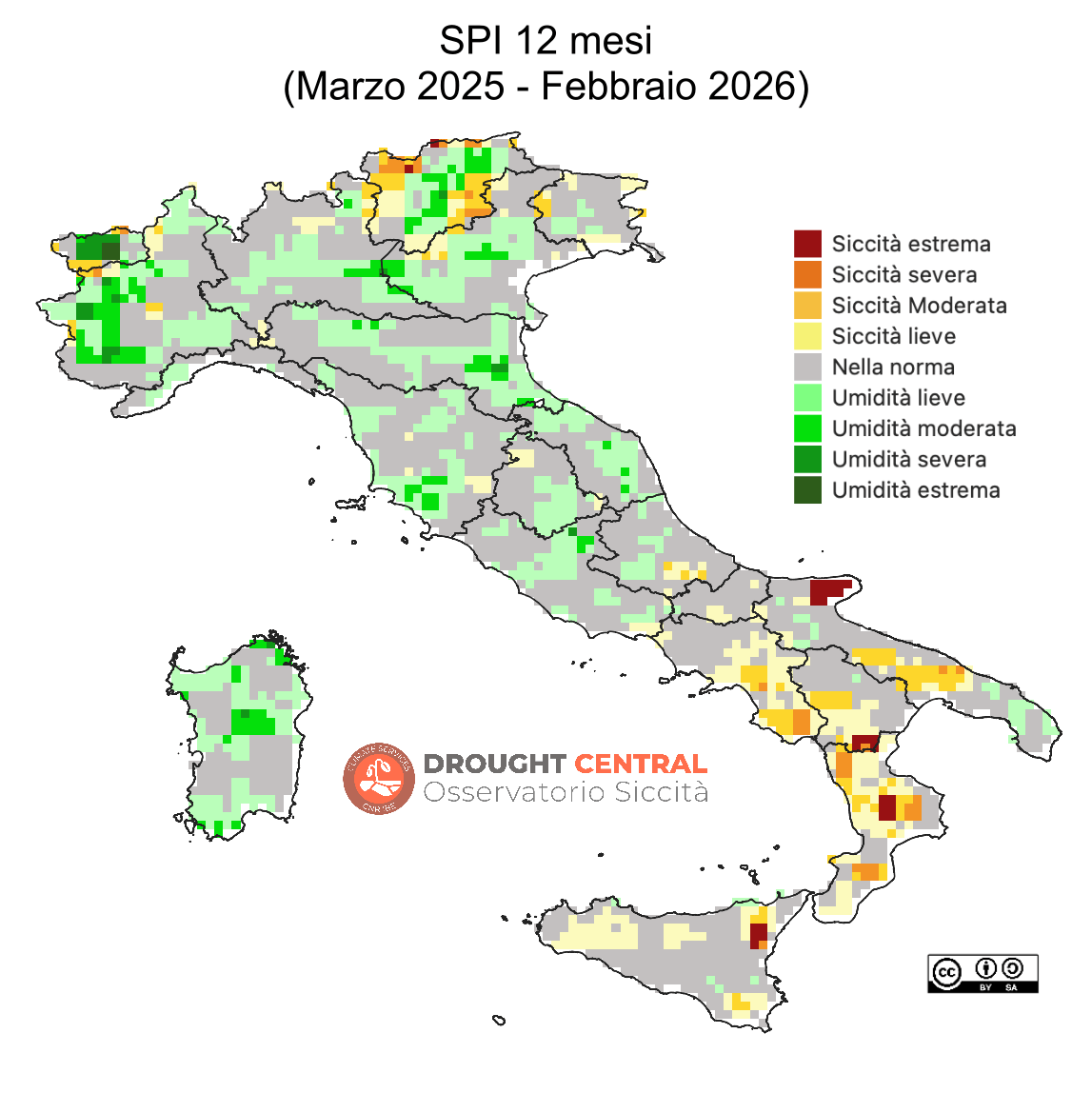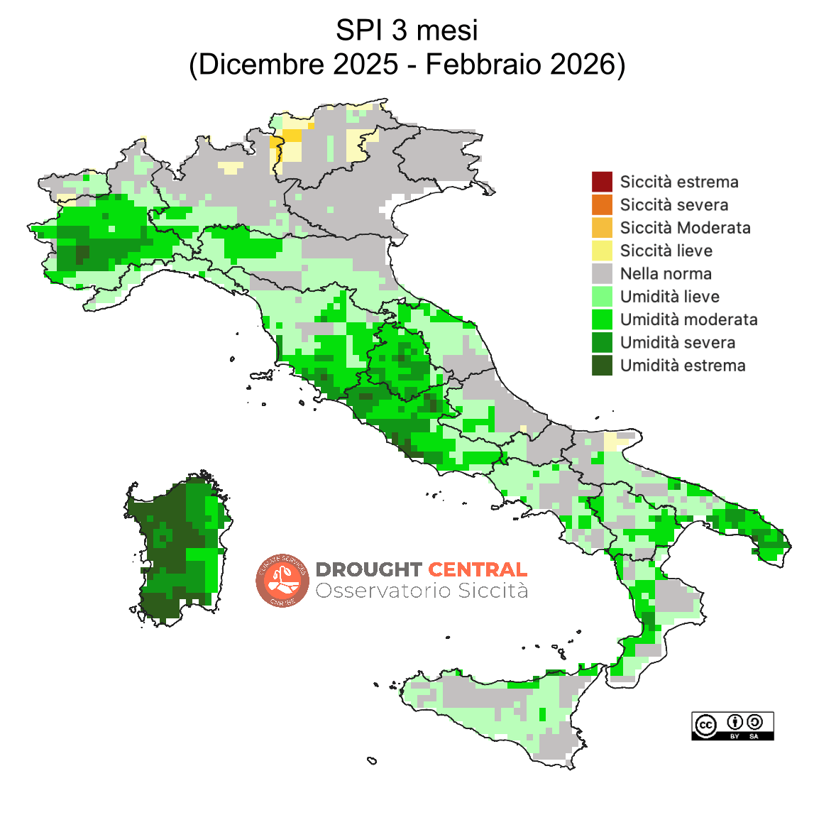 A Febbraio precipitazioni superiori alla media hanno interessato buona parte della penisola, con i surplus maggiori in Sardegna, Umbria, alto Lazio e Calabria. L’inverno chiude in surplus o nella norma, eccetto in Trentino-Alto Adige, dove sono visibili zone con deficit lieve-moderato. Il semestre autunno-invernale è stato caratterizzato da un generale comportamento in media, con aree sparse di surplus o deficit, quest’ultimo concentrato ancora sul settore alpino e prealpino centro-orientale. Sul lungo e lunghissimo periodo (12 e 24 mesi) oltre che sul Trentino-Alto Adige, persistono aree di siccità severo-estrema al sud.