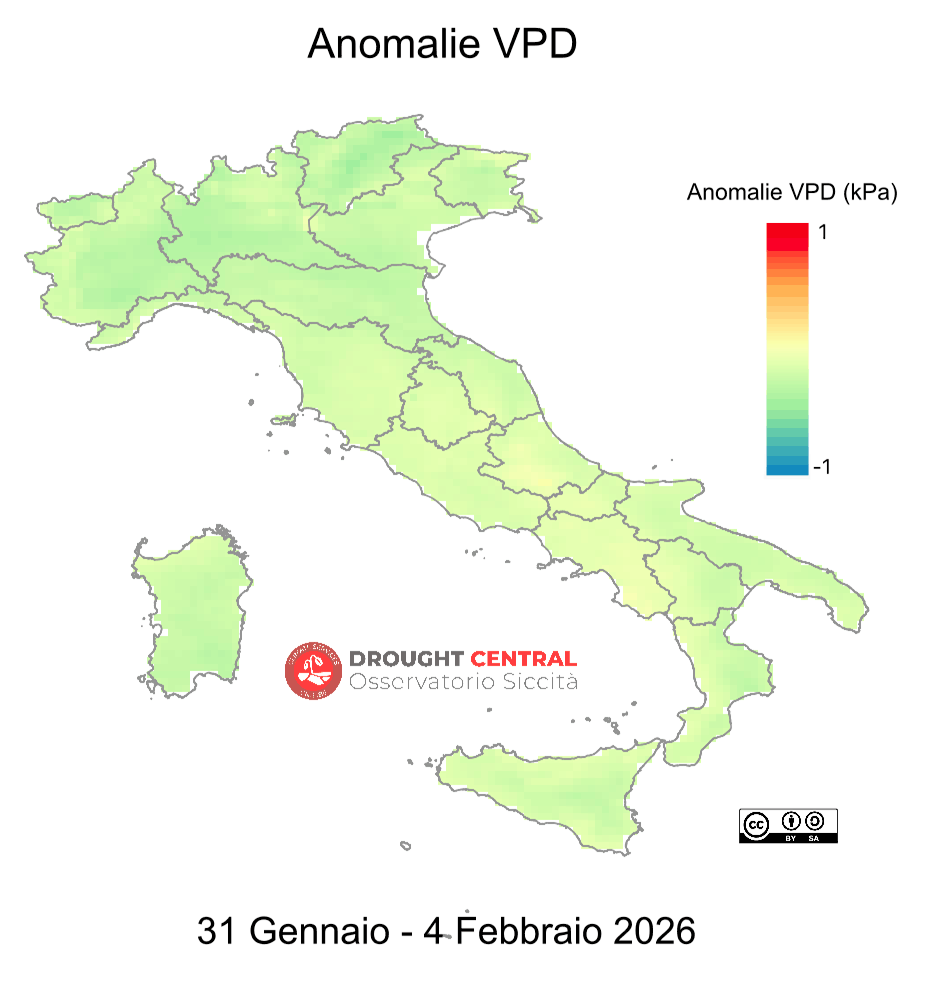 Il VPD – Vapor Pressure Deficit è una misura di quanto è secca (alto VPD) o umida (basso VPD) l’aria. Il protrarsi nel tempo di alti valori di VPD o anomalie positive rispetto ai valori medi, soprattutto nei mesi più caldi, può essere un indice di siccità e può influire sull’evapotraspirazione e sulla richiesta idrica delle piante e quindi sulla produzione agricola, nonché sull’evaporazione dalle acque libere come laghi, bacini e fiumi.