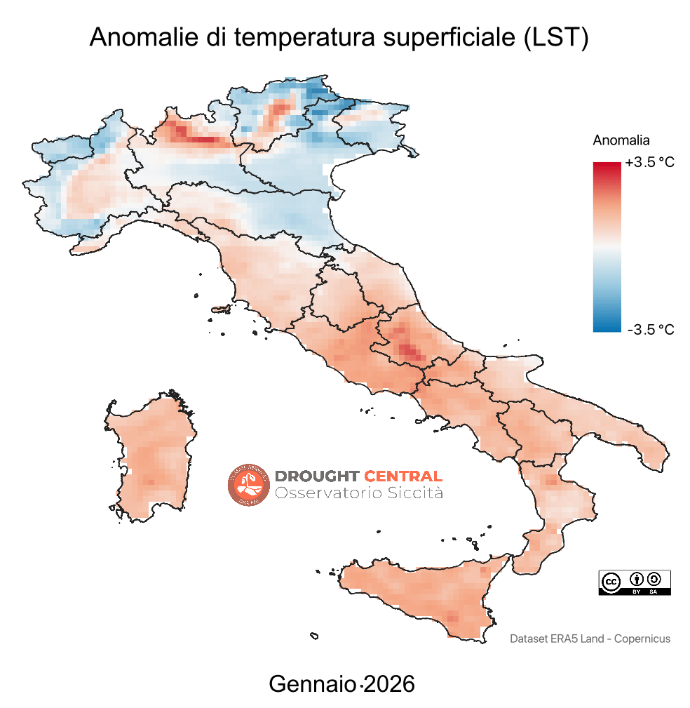 La Land Surface Temperature – LST o temperatura superficiale è una Variabile Climatica Essenziale derivata da osservazioni satellitari e descrive processi quali gli scambi di energia e acqua fra l’atmosfera le superfici, sia che si tratti di terreni nudi, parte sommitale delle chiome di un bosco o di una coltura, strade o tetti di edifici, specchi d’acqua o fiumi, superfici innevate, ecc.