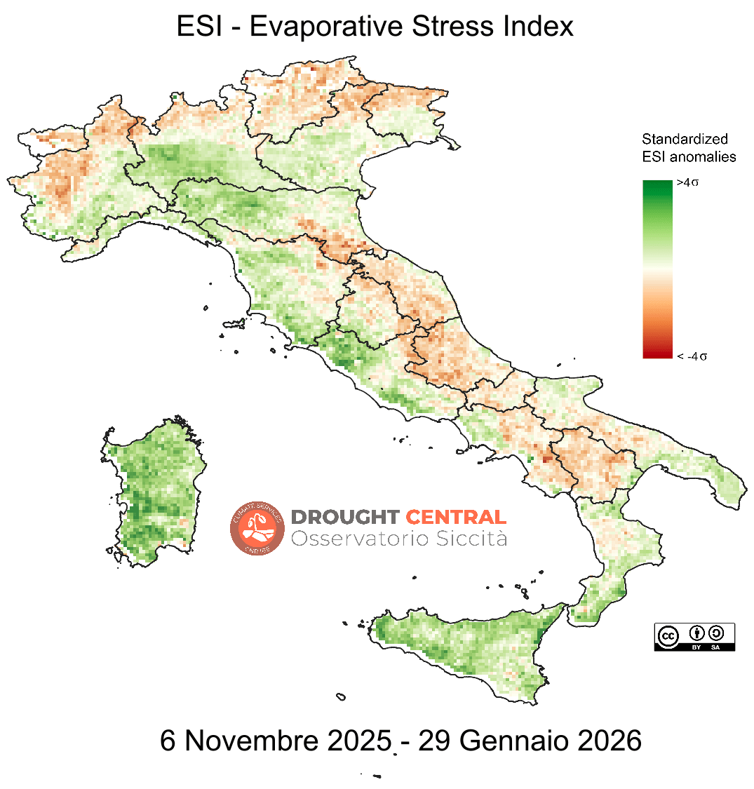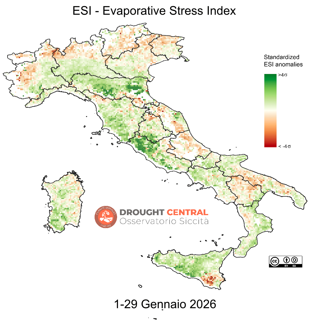 L’indice ESI (Evaporative Stress Index) quantifica anomalie temporali standardizzate del rapporto fra evapotraspirazione reale e potenziale e fornisce indicazioni “proxy” circa la rapida evoluzione dell’umidità superficiale del suolo e delle condizioni di stress delle colture.