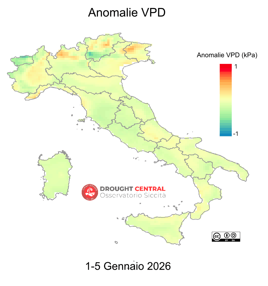 Il VPD – Vapor Pressure Deficit è una misura di quanto è secca (alto VPD) o umida (basso VPD) l’aria. Il protrarsi nel tempo di alti valori di VPD o anomalie positive rispetto ai valori medi, soprattutto nei mesi più caldi, può essere un indice di siccità e può influire sull’evapotraspirazione e sulla richiesta idrica delle piante e quindi sulla produzione agricola, nonché sull’evaporazione dalle acque libere come laghi, bacini e fiumi.